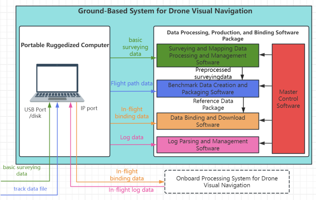The system consists of a visual navigation device, visual navigation software, connecting cables, and other components. The visual navigation system can be directly connected to the inertial navigation system or relay relevant navigation information through the flight controller.