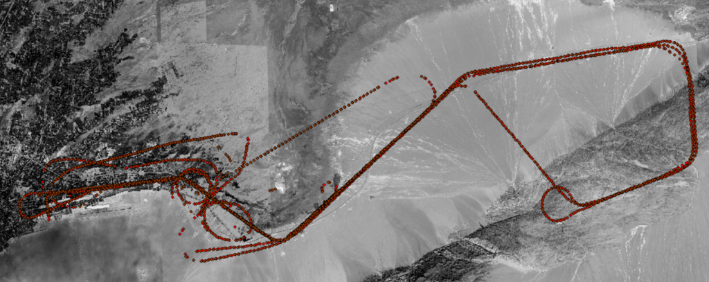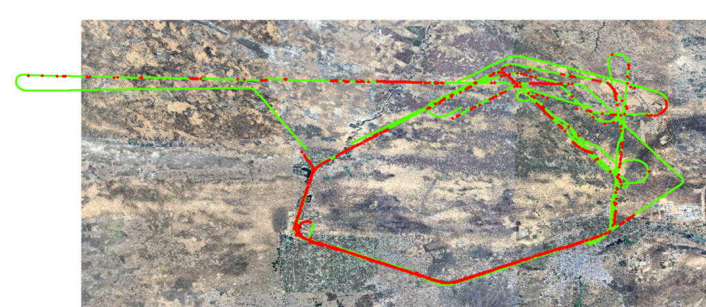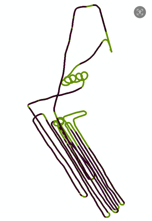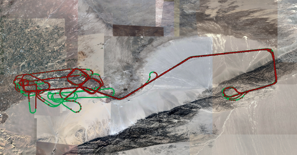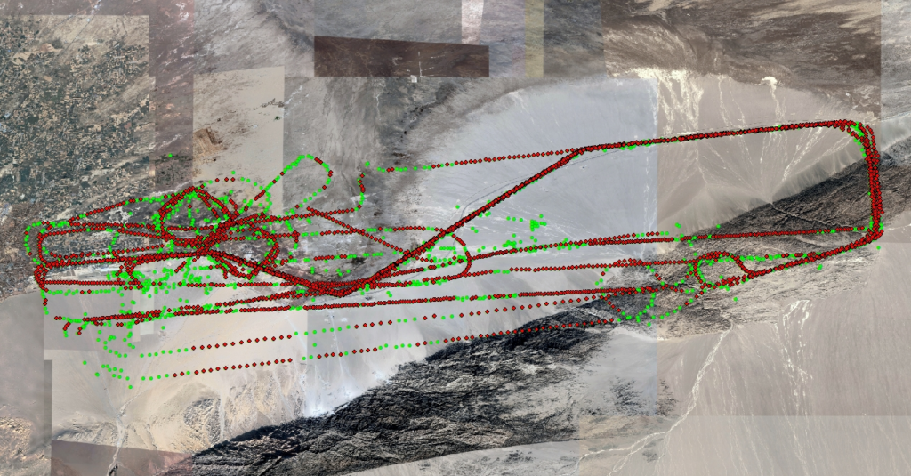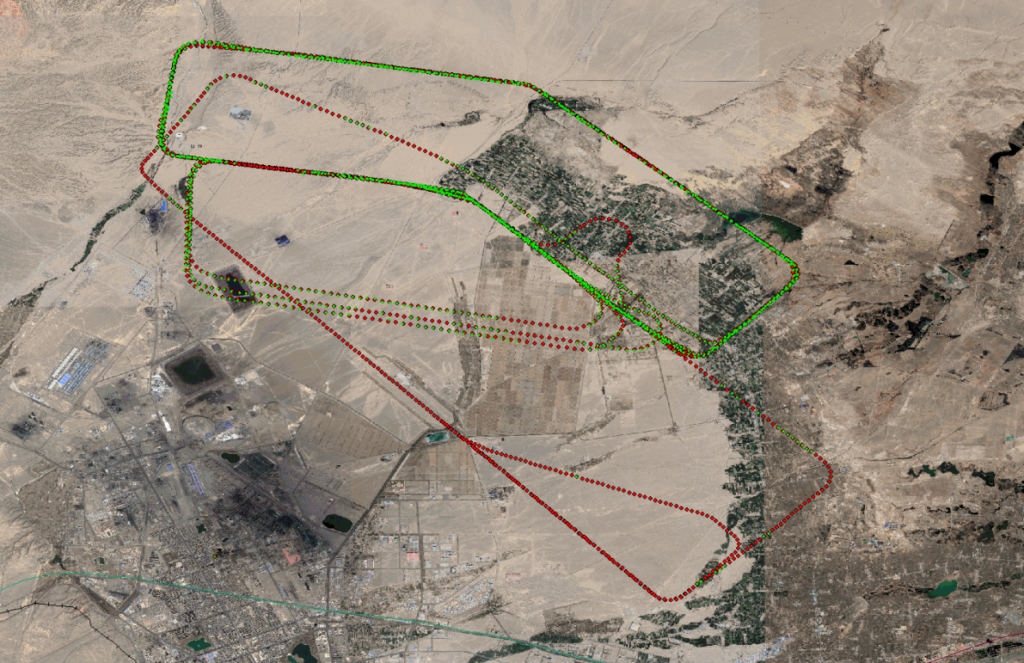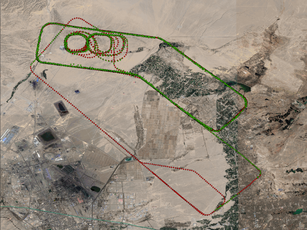 (First flight test results) A total of 2,235 real-time positioning matches were made, of which 2,195 were valid positioning data with an altitude greater than 450 meters. (The red dots represent the GPS-located flight path, and the green dots represent the available positioning results output.)