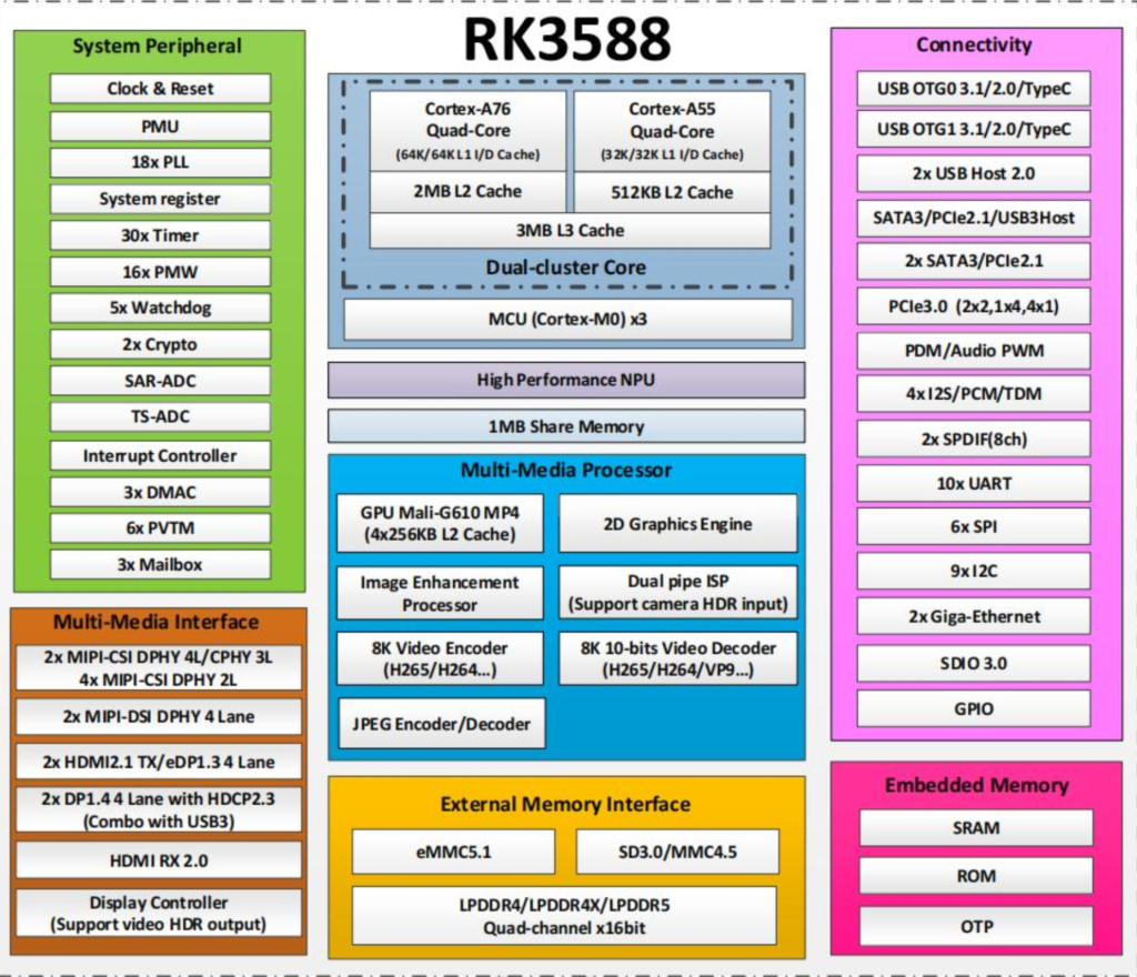 Includes: RK3588, power supply circuit unit, video input interface unit, DDR memory unit, eMMC storage unit, serial communication RS422, Ethernet communication, USB communication, and other interfaces.